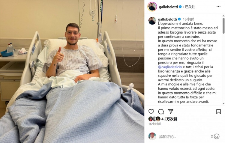 贝洛蒂在应答媒体上发布了术后浅笑的像片并配文:“手术弘扬告成。第一块砖一经铺好了,当今咱们要致力陆续引诱。在这个繁重技巧,你们的关怀对我至关蹙迫;我要感谢总计缅念念我的东谈主,感谢卡利亚里足球俱乐部及整体球迷的维持,也感谢我服从过的总计球队赐与我的祝贺。”