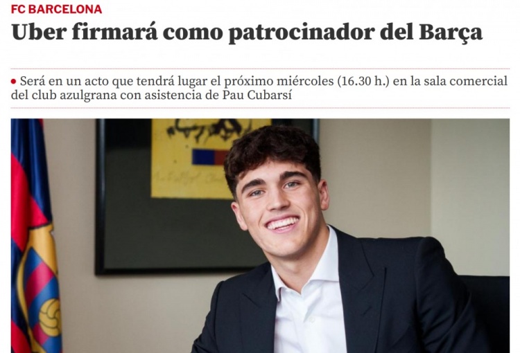 世体:巴萨下周三将与Uber签署提拔公约,库巴西将过问该活动
