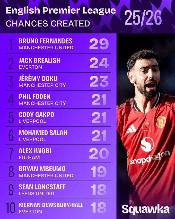 本赛季英超创造契机榜:B发奋压格拉利什居首,曼城、利物浦各2东说念主