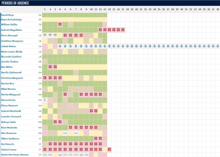阿森纳本赛季于今通盘伤员名单: