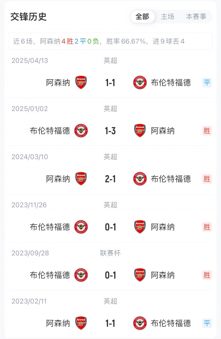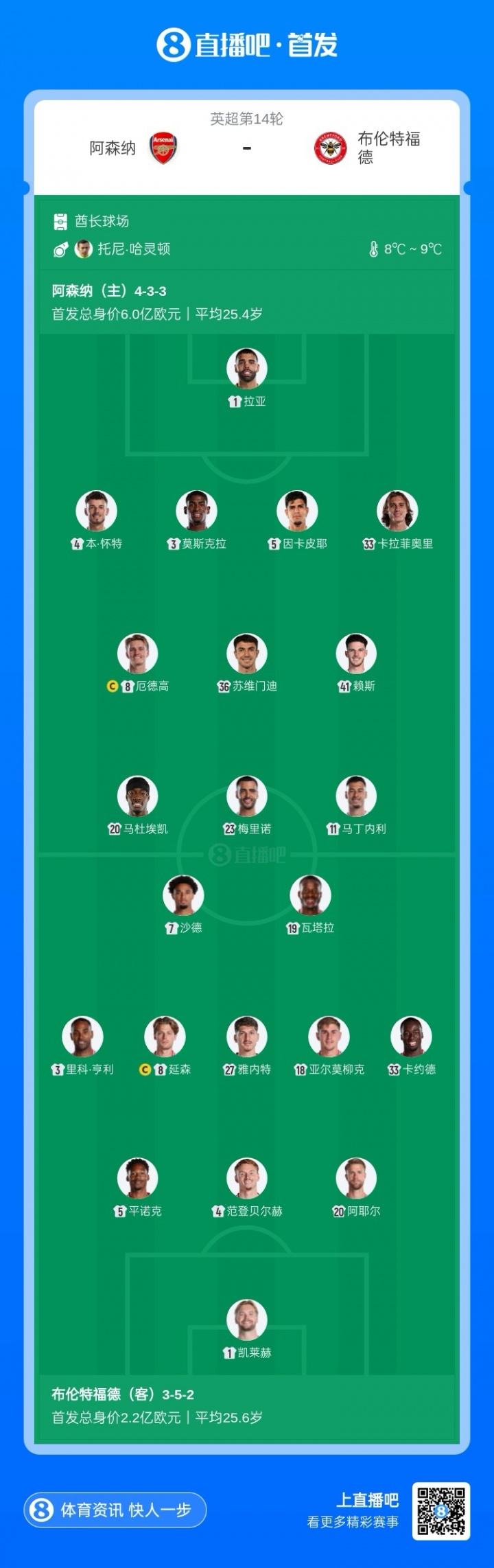 阿森纳联赛9胜3平1负积30分暂居英超榜首,各项赛事已畅通17场不败;布伦特福德联赛6胜1平6负积19分暂位英超第12,各项赛事近7场2负。阿森纳对阵布伦特福德已畅通9场不败(7胜2平),主场对阵布伦特福德已87年保抓不败。