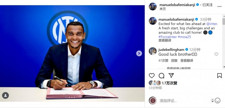 阿坎吉社媒晒出与国米签约的像片,配文:“对行将在国米迎来的新篇章感到感奋。全新的驱动,庞大的挑战,以及一个我不错称之为家的伟大俱乐部!”