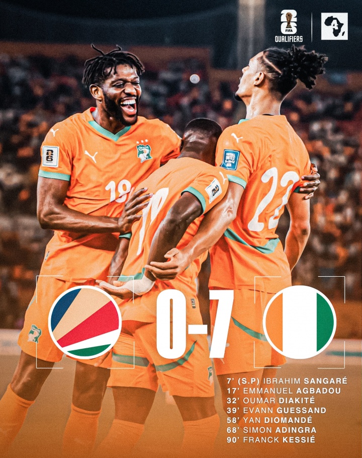 距天下杯一步之遥!科特迪瓦7-0塞舌尔,逾越第二1分+11个净胜球