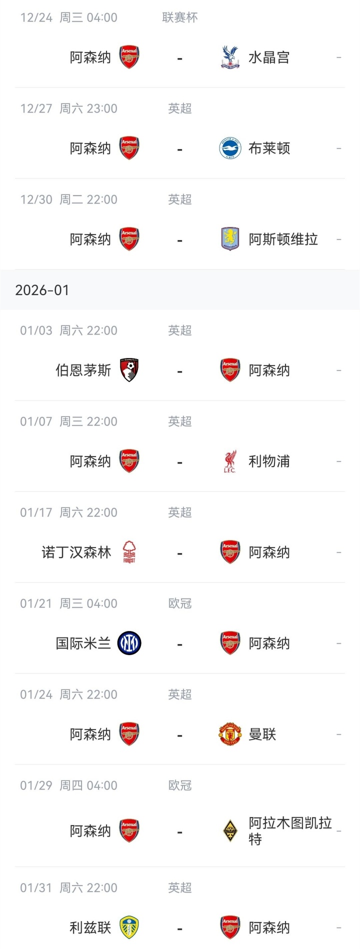 TA指出,改日8周阿森纳要面对至少14场比赛。