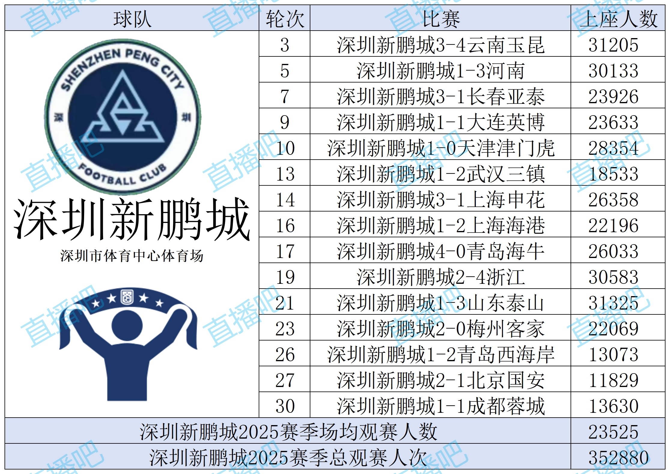深圳新鹏城2025赛季不雅赛东说念主数统计