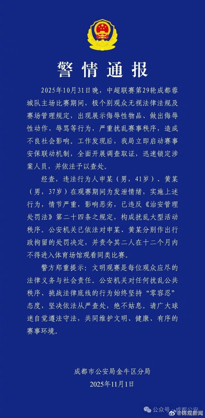 这并不是球迷口角球员的单一事件,2025年10月31日,成王人蓉城主场1-2不敌河南队的比赛中,成王人蓉城部分球迷对河南外助阿奇姆彭作念出学山公叫,口角“黑鬼”+竖中指,这些具有敌视性、侮辱性的言行,这也酿成了恶劣社会影响。之后成王人公安机关已照章对涉事球迷作出行政拘留的处罚决定,并且成王人蓉城俱乐部遭足协重罚50万+部分看台空场。