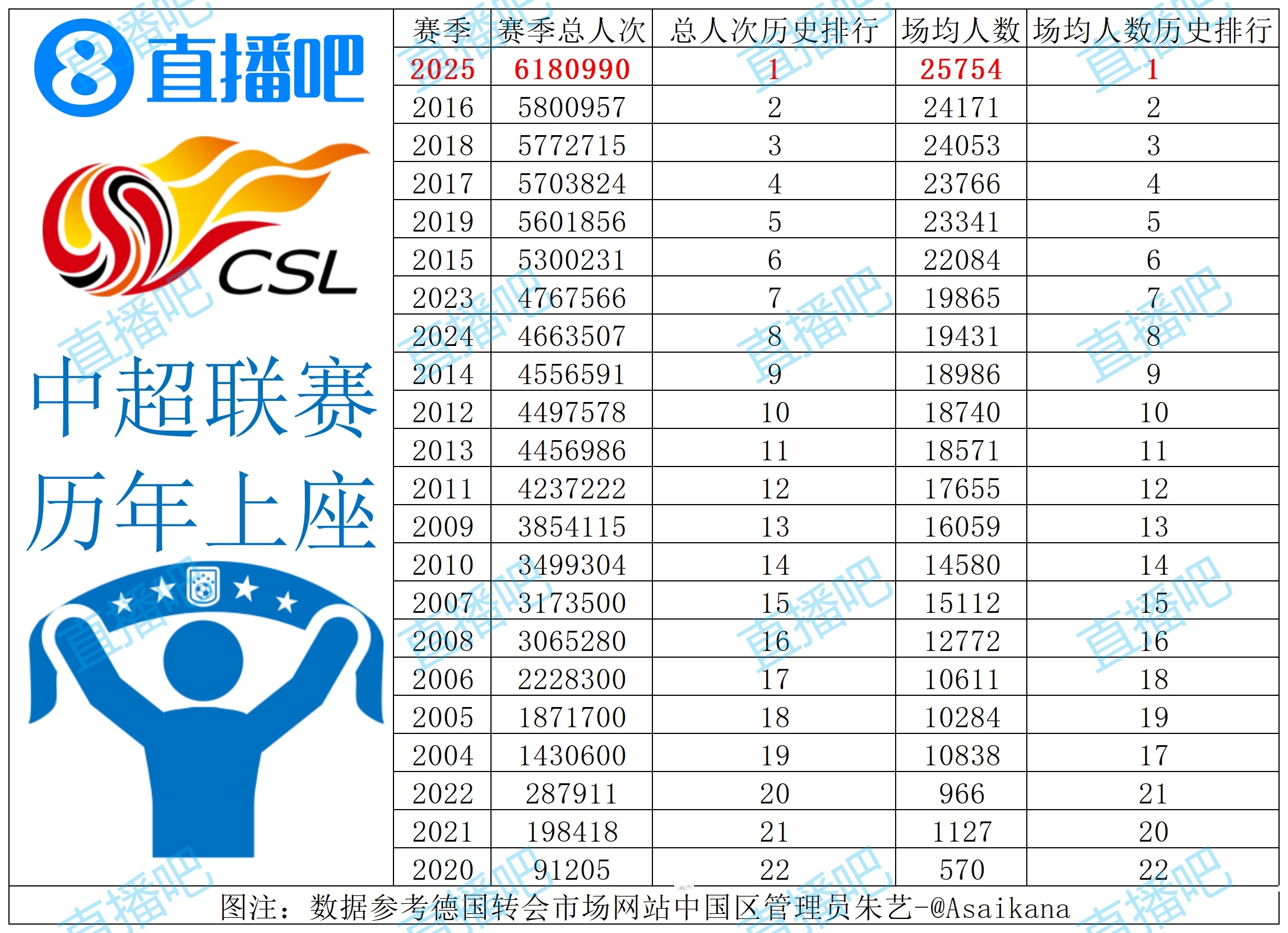 回来2025赛季,240场中超联赛共诱惑了现场不雅众6180990东说念主次,场均25754东说念主。对比2024赛季,2025赛季总不雅赛东说念主次高涨1517483东说念主次,同比增长32.53%!2025赛季是中超联赛开荒以来,球市最火爆的一个赛季,刷新此前2016赛季创造的5800957总不雅赛东说念主次记载!