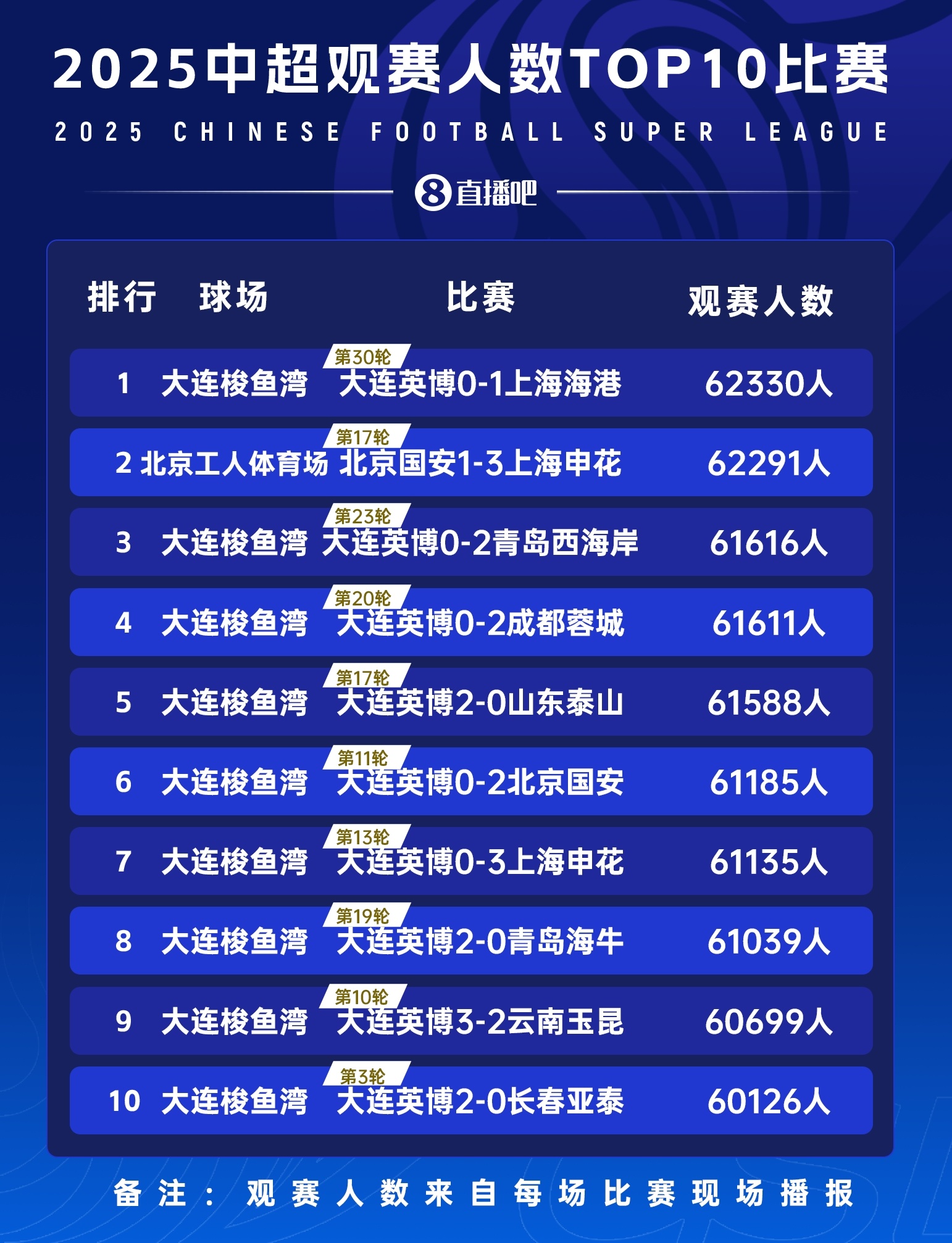 看到这里,要是问你本赛季不雅赛东说念主数TOP10的比赛是哪些场次?这个谜底应该不难猜了,是的大部分是大连英博所创造,本赛季上座前十名比赛其中9场来温情连梭鱼湾。大连英博赛季收官战0-1海港的比赛,有62330东说念主涌入梭鱼湾现场不雅战,毒害了本赛季北京国安1-3上海申花62291东说念主不雅战记载,在临了时刻刷新本赛季中超的上座东说念主数记载。