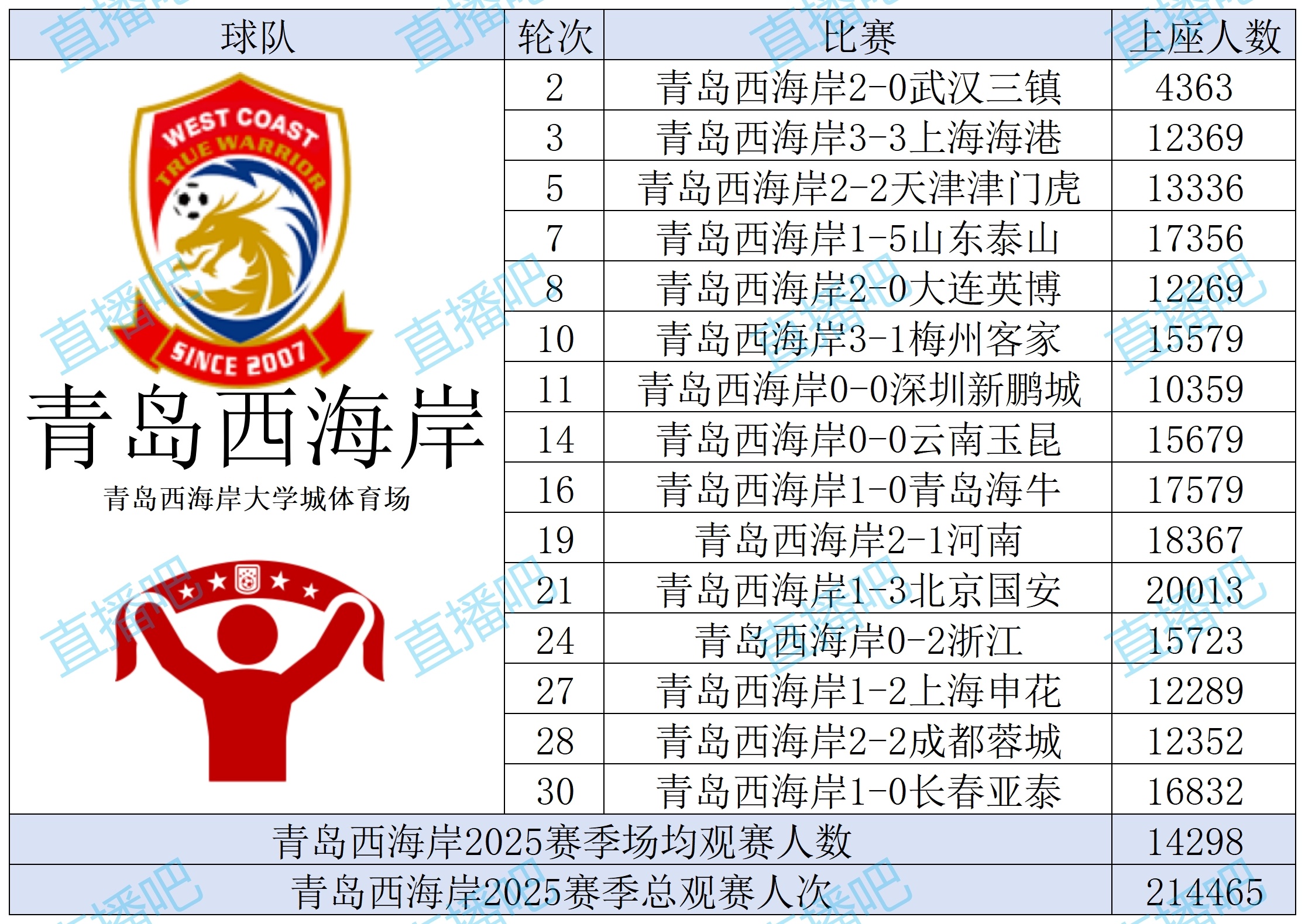 青岛西海岸2025赛季不雅赛东说念主数统计