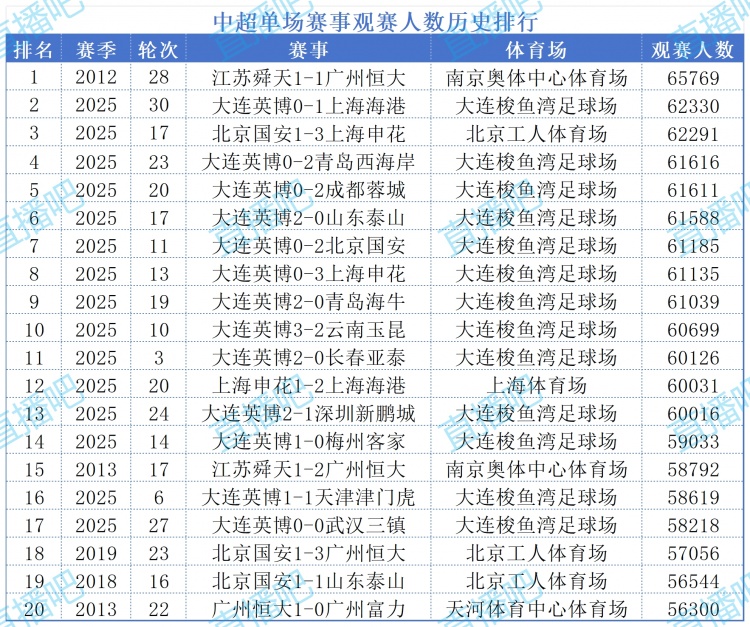在不停刷新本赛季上座记载的同期,大连英博也不停在刷新中超单场赛事不雅赛东说念主数历史排名,把柄统计TOP历史不雅赛20比赛中,大连英博就独占13场。主场收官62330东说念主的上座东说念主数也排进了中超历史上座记载的第二位,仅次于2012赛季江苏舜天1-1广州恒大的65769东说念主。