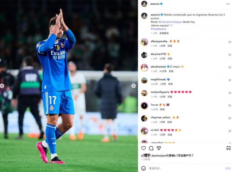 本场比赛劳尔·阿森西奥首发登场,赛后他也在社媒发文饱读吹球队:“一场死战未能成绩得手,但咱们要从今天开启欧冠式样,皇马加油!”