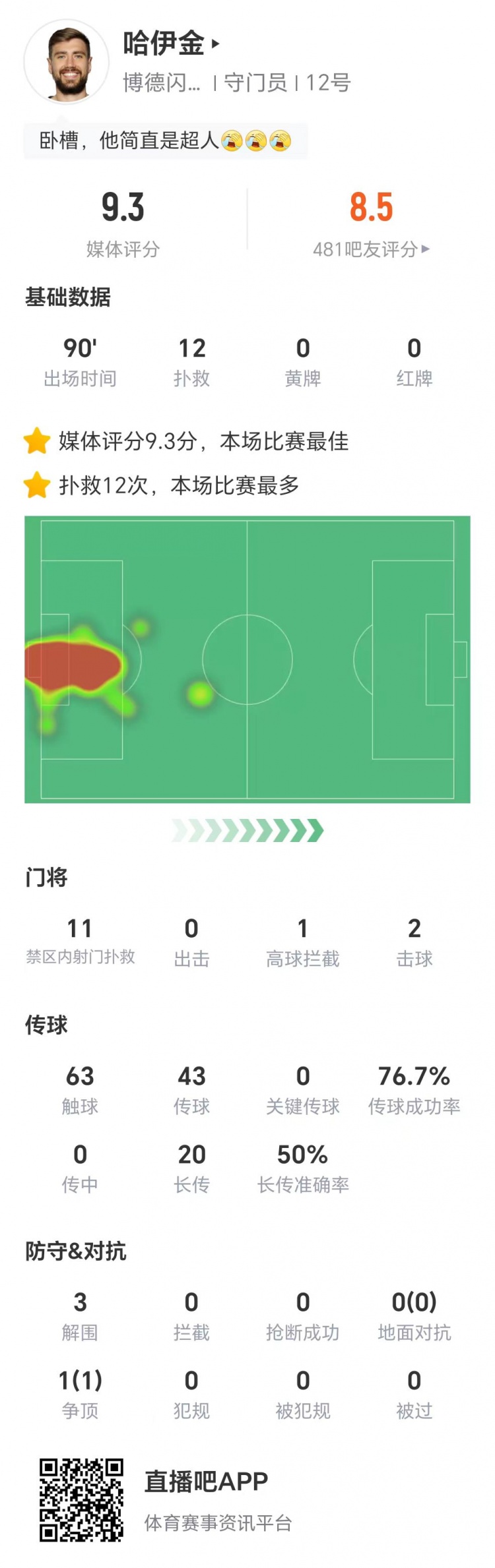 赛后工夫统计数据表示,哈伊金本场比赛共有12次扑救,其中11次齐是靠近尤文禁区内的射门。另外,他还有3次突围。