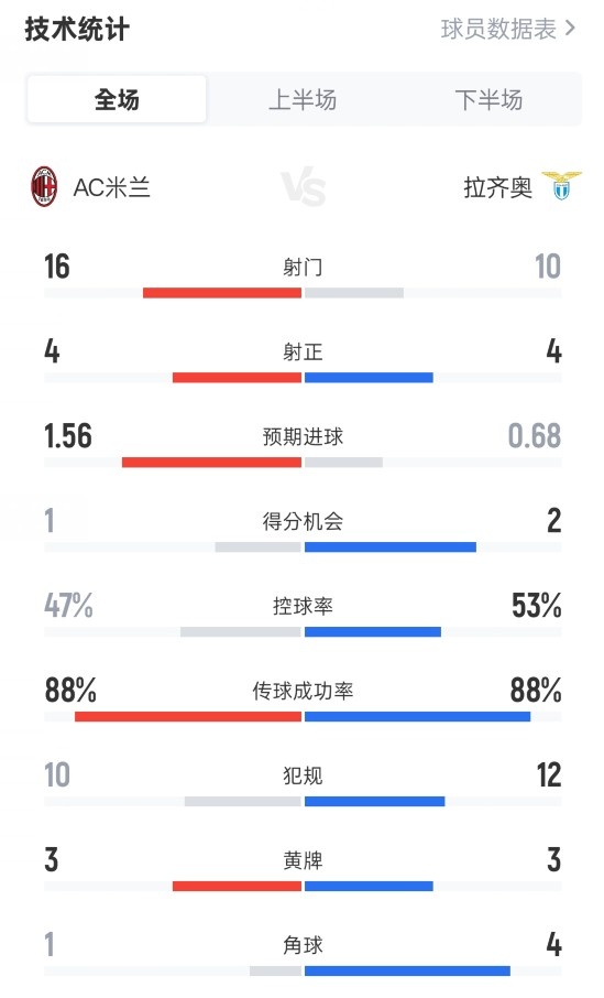 米兰1-0拉王人奥全场数据:射门16-10,射正4-4,控球率47%-53%