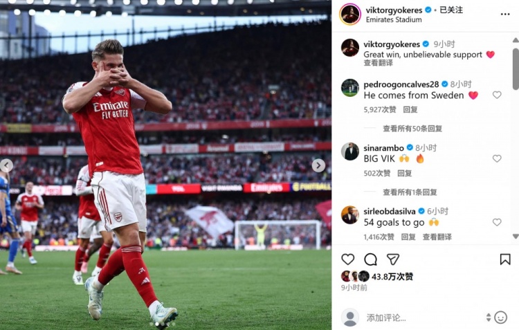 本场比赛阿森纳新援约克雷斯梅开二度,赛后他在个东说念主社媒晒出标识性庆祝作为,配文写说念:“漂亮的得胜!球迷们的复古难以置信!”