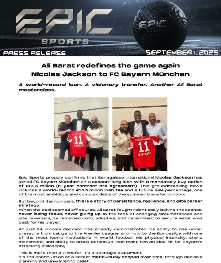“Epic Sports自重地晓谕,塞内加尔国脚尼古拉斯-杰克逊已加盟拜仁慕尼黑,模样为为期一年的租赁,附带强制买断要求,总价为8150万欧元(契约包含5年合同预签)。”