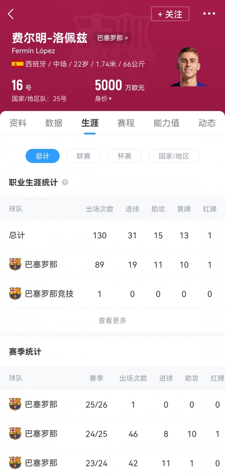 22岁的费尔明出自巴萨青训,规模现在共为巴萨一线队出场89次,打入19球11助攻,他的德回身价为5000万欧元。