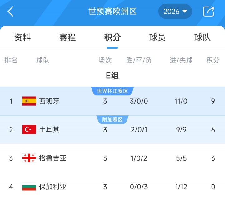 辞世初赛欧洲区E组积分榜上,土耳其2胜1负积6分名次小组第2,过时榜首西班牙3分;由于11个净胜球的广宽差距,即使土耳其在与西班牙的告成对话中到手,也很难小组头名纵贯天下杯,争夺附加赛履历对土耳其来说是更有可能的选拔。