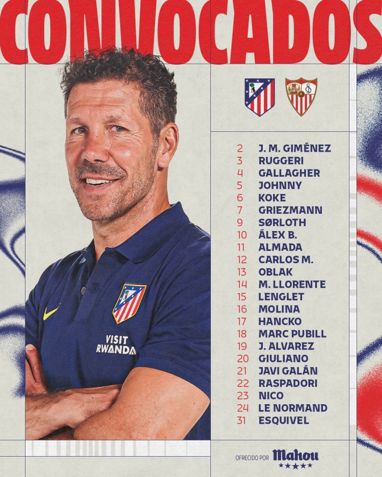 马竞主场对阵塞维利亚大名单:格列兹曼领衔,巴里奥斯缺席