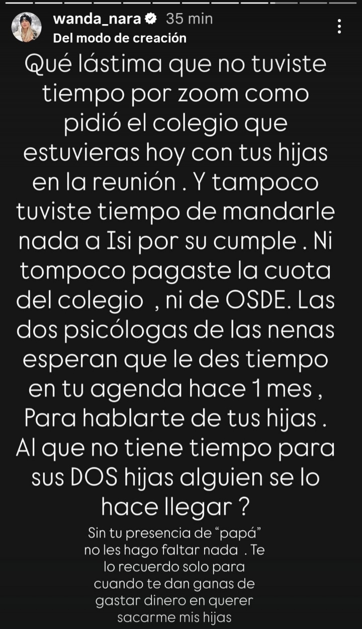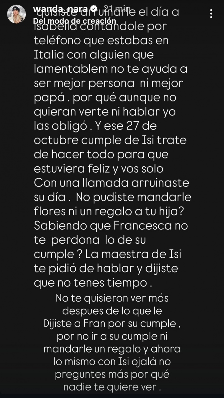 旺达:你思通过电话告诉伊莎贝拉你很缺憾介意大利和一个不成让你成为更好的东说念主、也不成让你成为更好爸爸的东说念主在统统这个词,以此解除她的一天。尽管她们不思见你、不思和你语言,我依然免强她们(和你关系)。10 月27日伊西的生辰,我戮力让她清翠,而你只打了一个电话就毁了她的一天。你就不成给你儿子送束花或一份礼物吗?你明知弗朗西斯卡还没包涵你没干涉她的生辰、没送她礼物,咫尺对伊西又故技重施。希望你别再问为什么没东说念主思见你了。