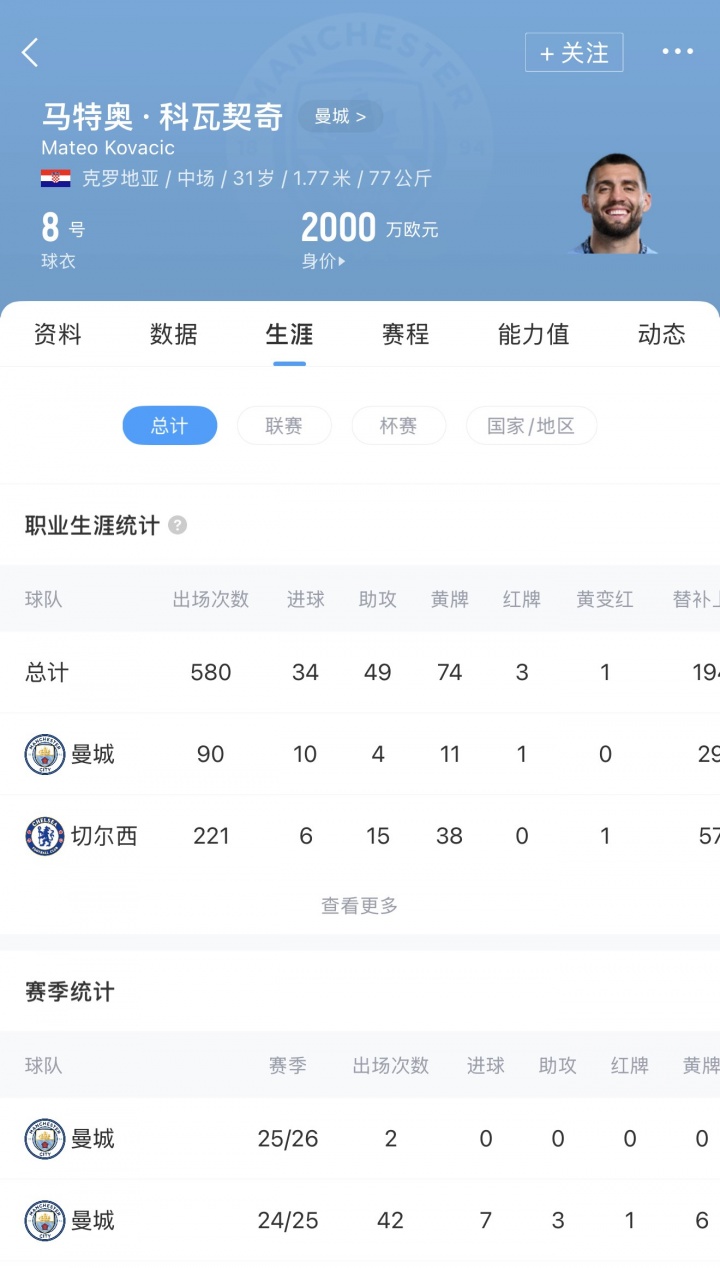 科瓦契奇今夏袭取跟腱手术后,本赛季尚未为曼城首发过。他在九月对阵伯恩利时伤愈干与比赛名单,但仅在对阵埃弗顿和比利亚雷亚尔时替补出场。