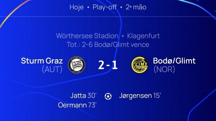 尽管次回合1-2输球,但博德能干总比分6-2淘汰格拉茨风暴,获取欧冠正赛阅历。