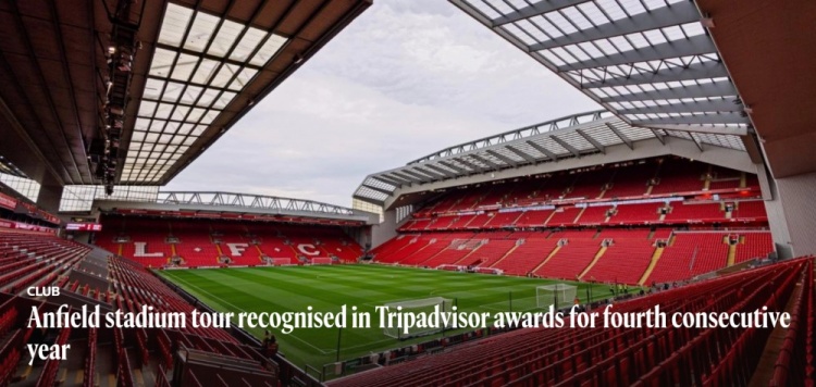 利物浦官方:安菲尔德及博物馆之旅持续4年获评群众前10%优秀景点