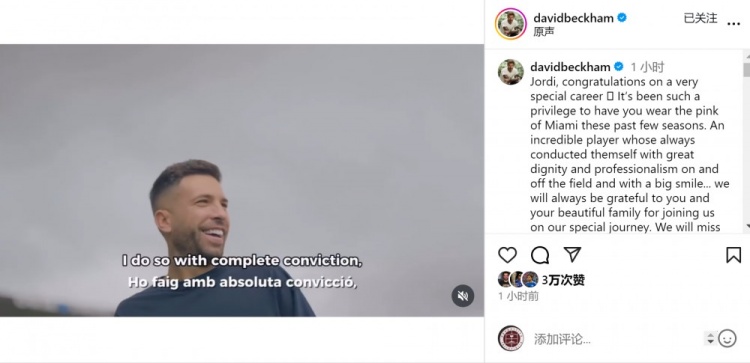贝克汉姆致意阿尔巴:很行运有你为迈阿密着力,咱们会思念你
