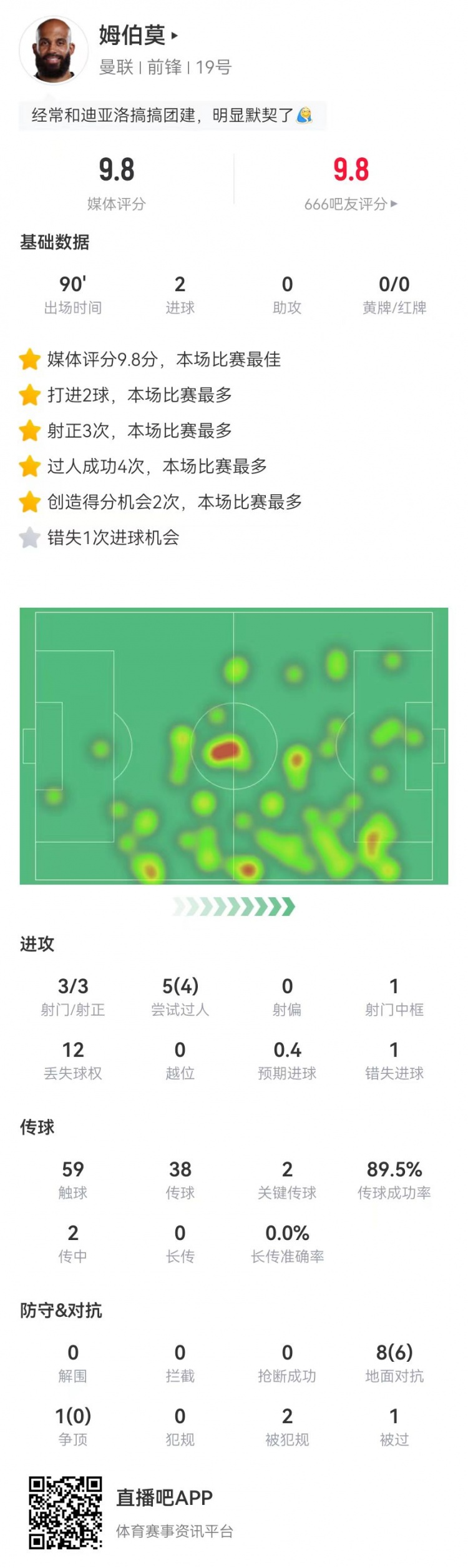 姆伯莫本场3射3正进2球+1失良机 5过东谈主4告捷 9顽抗6告捷 获9.8分