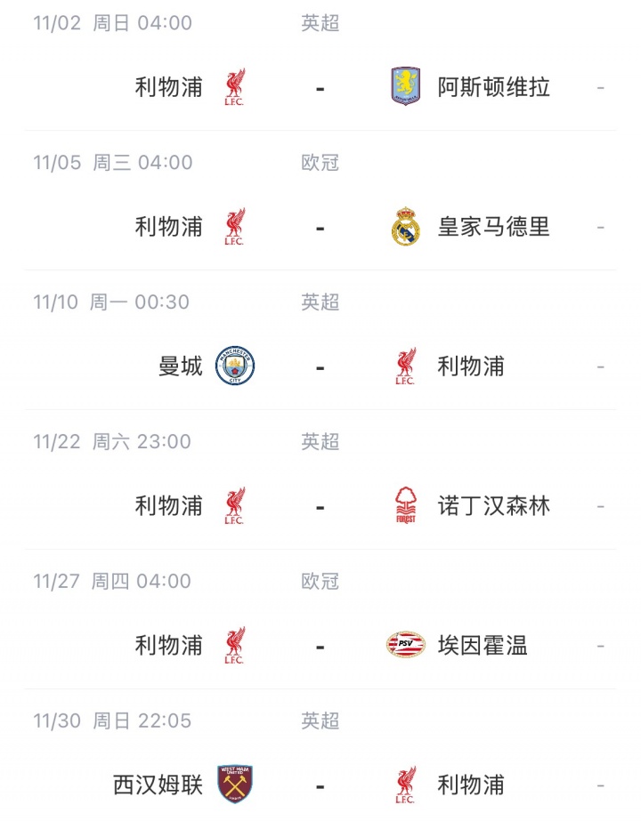 利物浦11月赛程贫窭,2号联赛迎战维拉,5号欧冠对阵皇马,随后将客战曼城。