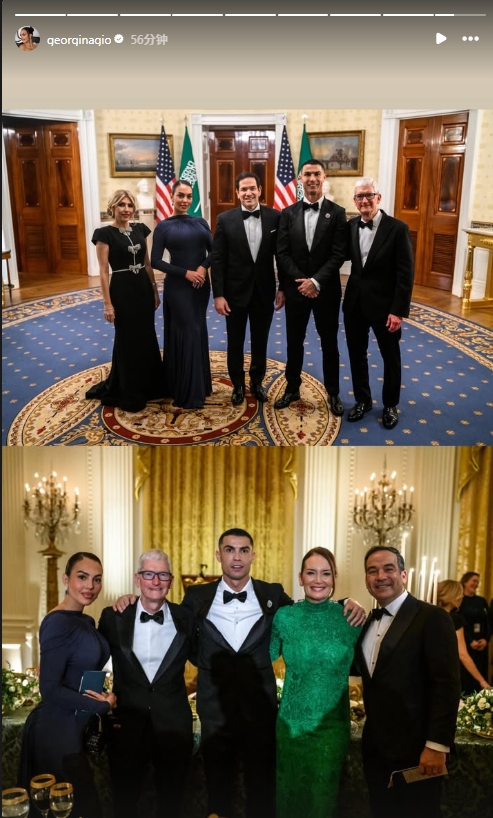 图中C罗、乔治娜与苹果公司CEO库克等东谈主合影。
