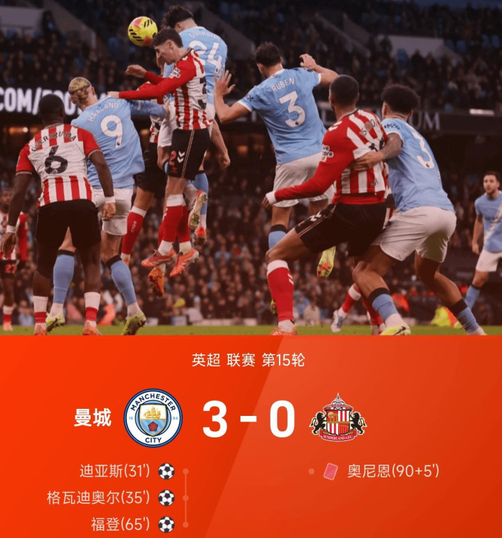 第70分钟傍边,福登再度发力,策应谢尔基的传中冲顶立功,曼城3-0锁定胜局。补时阶段,桑德兰替补奥尼恩因坏心犯规被红牌罚下,最终曼城3-0大捷,豪取英超主场七连胜 。