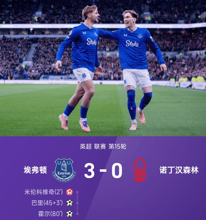 埃弗顿3-0诺丁汉丛林:开场乌龙+霍尔独造两球,太妃糖大捷领跑