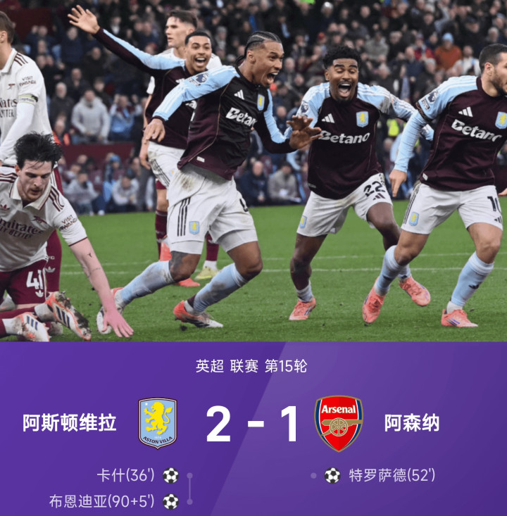 阿斯顿维拉主场迎战联赛领头羊阿森纳的焦点战,号称本轮最具戏剧性的对决,维拉凭借补时阶段的绝杀,2-1力克枪手,豪取各项赛事七连胜,阿森纳则遣散18场不败记录,英超争冠方式生变。