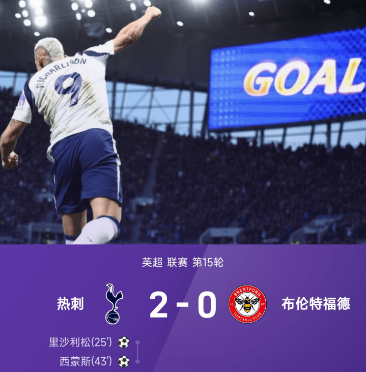 热刺2-0布伦特福德:西蒙斯传射立功,热刺半场锁定胜局