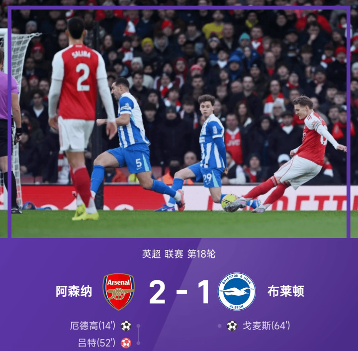 25-26赛季英超联赛第18轮,阿森纳镇守酋长球场迎战布莱顿。此役上半场,厄德高禁区外策应萨卡横传起左脚远射破门斩获个东谈主赛季首球。易边再战,赖斯角球传中制造吕特争顶突围时自摆乌龙,戈麦斯门前补射掷中助布莱顿追回一球,加布里埃尔伤愈复出替补换下斯凯利。全场比赛为止,阿森纳2-1布莱顿,链接领跑。