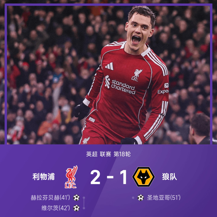 25/26赛季英超联赛第18轮,利物浦2-1驯服狼队。全场比赛,维尔茨攻入英超处子球,进展精通全场、赫拉芬贝赫破门立功,圣地亚哥破门难救主。最终利物浦2-1打败狼队,送敌手18轮不堪。利物浦豪取联赛3连胜,积分32分杀入前4。