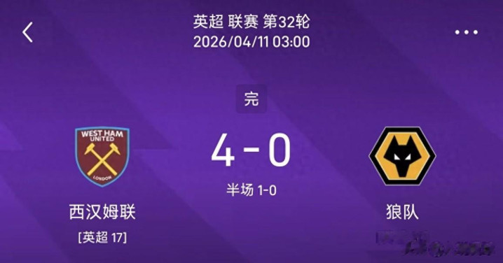 西汉姆联4-0狼队