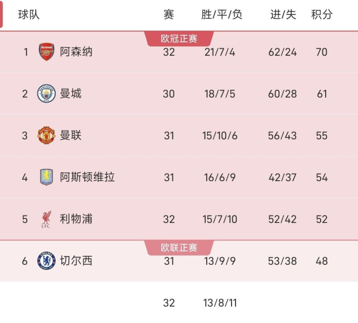 英超最新积分榜:阿森纳32场21胜7平4负积70分,领跑 少赛两轮的曼城9分,暂列积分榜第一;曼城30场18胜7平5负积61分,暂列积分榜第二;曼联31场15胜10平6负积55分,暂列积分榜第三。