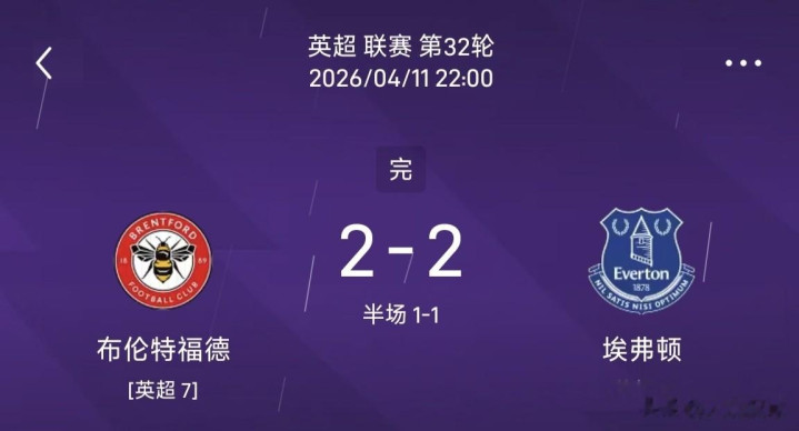 布伦特福德2-2埃弗顿