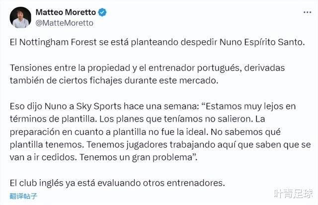 2025-26赛季英超开幕仅一周,就有球队筹画换帅。8月22日,知名记者Matteo Moretto显现,诺丁汉丛林雇主马里纳基斯,与主帅努诺产生矛盾。努诺公开痛恨球队夏窗引援不力,球队远远莫得准备好。诺丁汉丛林还是作念好与努诺分说念扬镳的准备,运转物色新帅东说念主选。