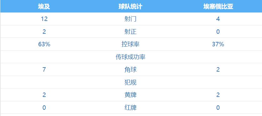 埃及国度队严重条理流露的着力即是战争力不彊,在埃及2-0打败埃塞俄比亚的比赛中,埃及有着63%的控球率,一共有12次射门,其中仅有2次射正,均来自点射;埃塞俄比亚一共有4次射门,其中0次射正。