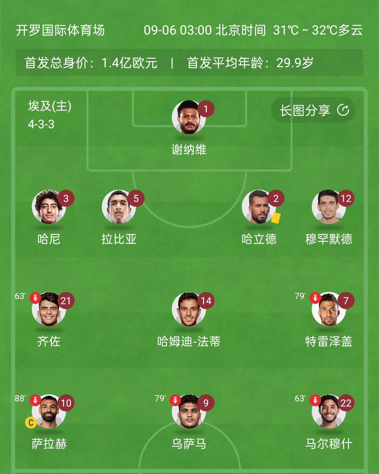 埃及简直一支严重条理流露的国度队,埃及vs埃塞俄比亚,埃及433阵型,首发身价高达1.4亿欧元,但球队首发身价绝大部分商酌在两位英超先锋身上,其中利物浦先锋萨拉赫身价5000万欧元,马尔穆什7500万欧元,两东谈主的身价整个1.25亿欧元,这意味着埃及首发剩余9东谈主的身价整个才1500万欧元,如斯条理流露的国度队确乎是出奇。