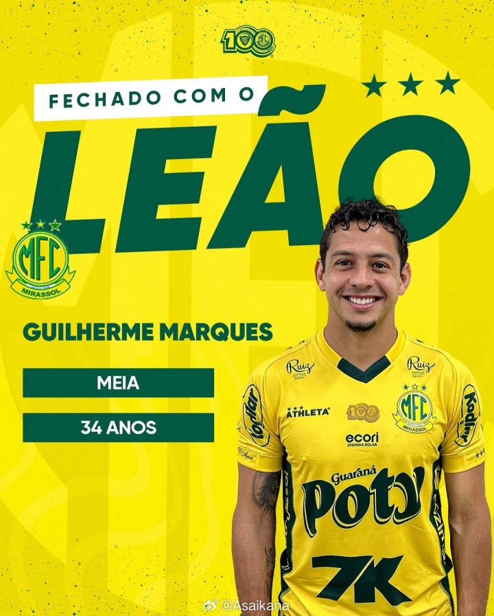 巴甲联赛球队米拉索尔(Mirassol-SP)官方通告签下了此前在长春亚泰服从的巴西球员吉列尔梅(Guilherme Costa Marques)。现年34岁的吉列尔梅曾两次来华,分辩服从于广州城、长春亚泰。2024赛季在亚泰服从时刻碰到十字韧带重伤,因而淡出一线队名单。他于本年4月伤愈复出,但未能不竭留在亚泰服从。夏转时刻临了时分曾试图加盟另一支中超球队,但最终未能成行。