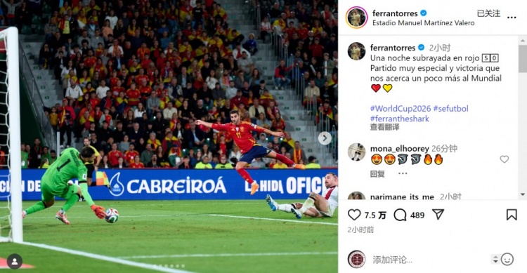 此役是费兰-托雷斯为西班牙队出战的第50场比赛,他在酬酢媒体上晒出比赛像片,配文:“值得铭记的夜晚,为西班牙出战50场,这是一场十分至极的比赛,告捷让咱们距离寰宇杯更近一步。”