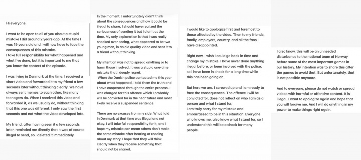 我莫得任何借口,我其时在丹麦的行径既犯警也失当当,我将承担一都拖累,并但愿我的失误能警示他东谈主——当听到或读到我的故事时,请务必保捏贯通,切勿传播不该传播的实质。