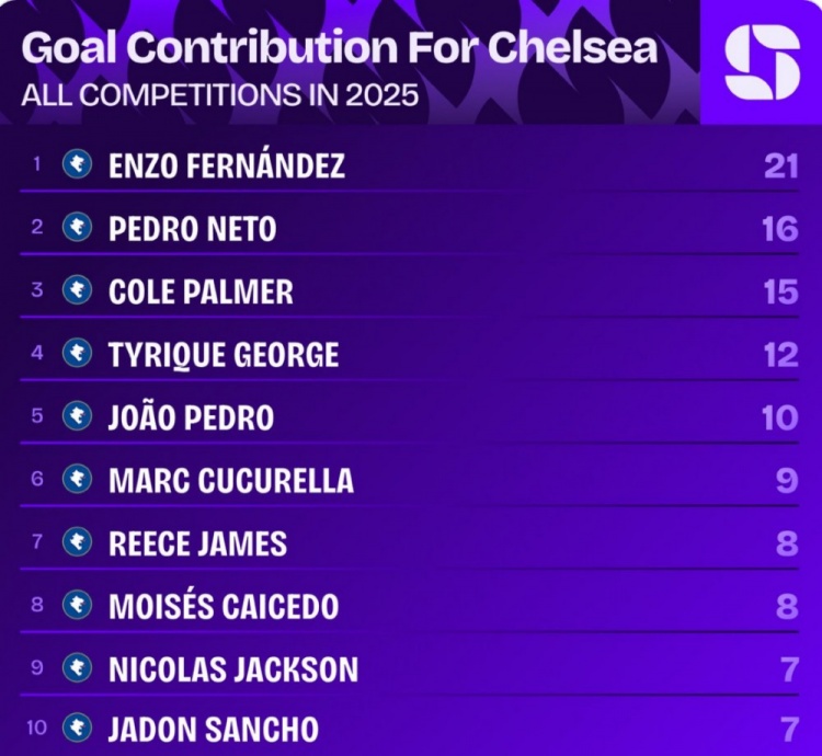 2025年切尔西参与进球名次(所有赛事):