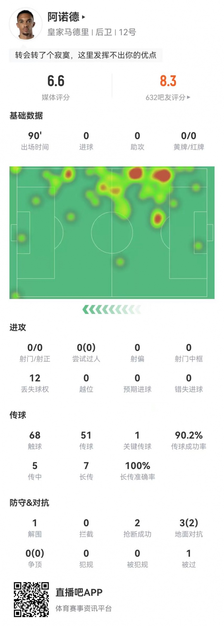 阿诺德本场1关节传球+7长传全见效 2抢断+12丢失球权 获评6.6分