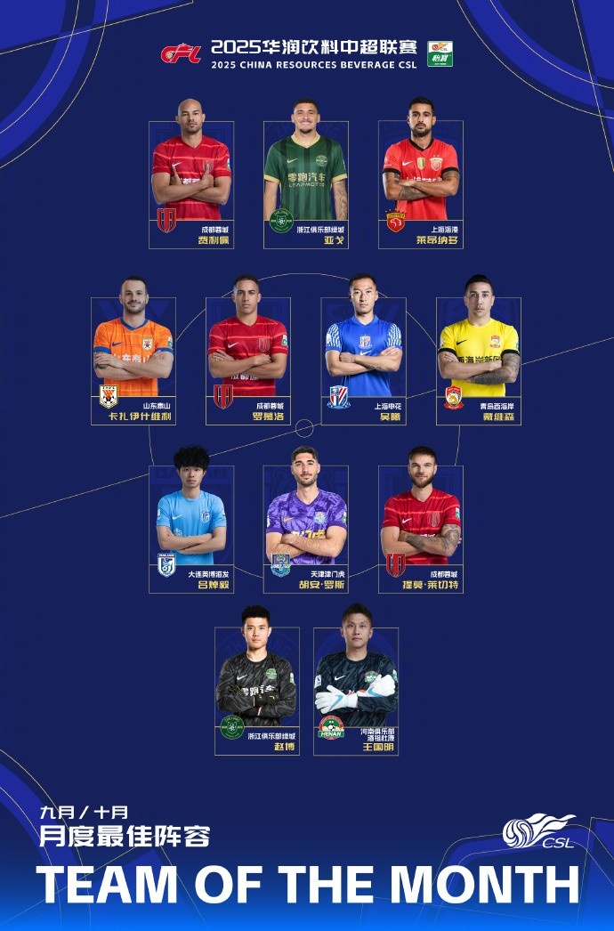 中超9/10月最好声势:瓦科、吕焯毅在列,两门将入选,蓉城三东说念主