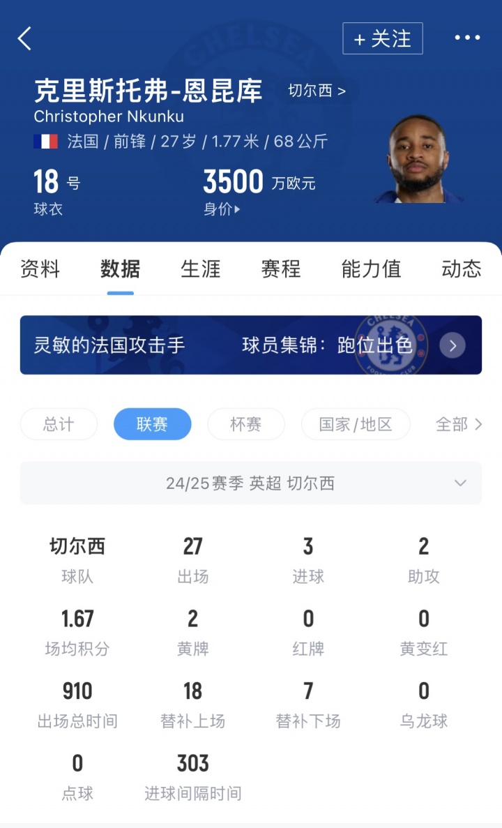 恩昆库现年27岁,与切尔西现存合同在2029年到期,现德转估值为3500万欧。恩昆库2023年夏窗6000万欧从莱比锡加盟切尔西,当今已出场62次,打入18球并有5次助攻。