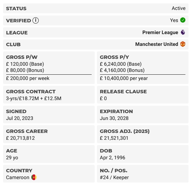 特地裸露球员薪资的机构capology泄露,奥纳纳在曼联上赛季基础总薪资约为620万镑,未算奖金,尽头于周薪12万镑,这一数字被秀气为“已证实”。